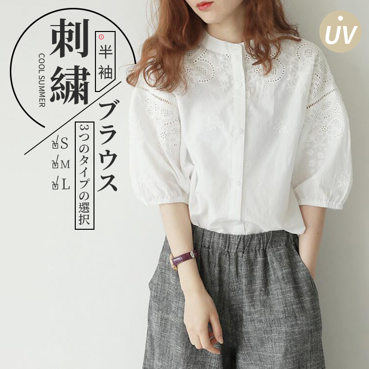 刺繍スタンドカラーブラウス ブラウス レディース 半袖 綿 トップスレディースファッション トップス シャツ ブラウス