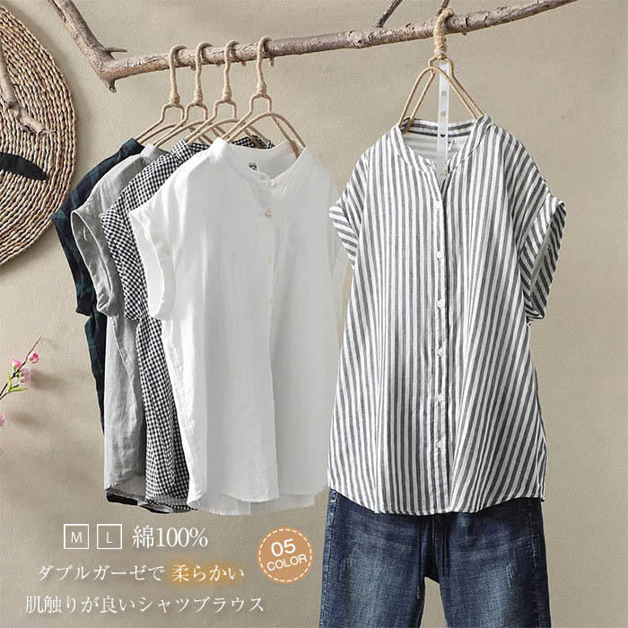柔らかな着心地のダブルガーゼ コットン100% シャツブラウス レディース スタンドカラー シャツ ブラウス 半袖 トップス フレンチスリーブ カジュアル 無地 チェック ストライプ