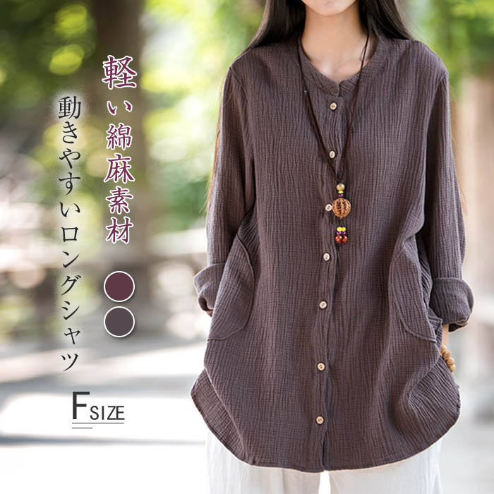 ガーゼ シャツ レディース 長袖 ノーカラー 2重ガーゼ シャツブラウス トップス 春 夏 秋 冬 カジュアル ナチュラル ダブルガーゼ 羽織り 体型カバー 涼しい