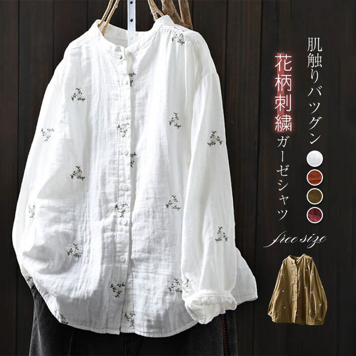 花柄 刺繍 ガーゼ シャツ 長袖 バンドカラー 2重ガーゼ シャツブラウス レディース トップス 春 夏 秋 冬 カジュアル ナチュラル ダブルガーゼ 羽織り