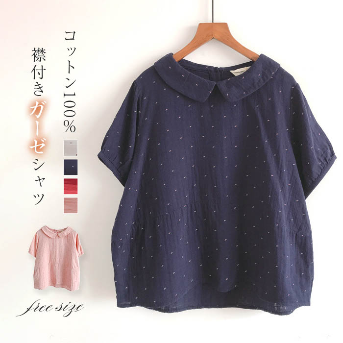 涼しい ガーゼ シャツ ブラウス レディース 半袖 夏 春夏 ダブルガーゼ 綿100% シャツブラウス ガーゼシャツ プルオーバー トップス 襟付き 大人 可愛い