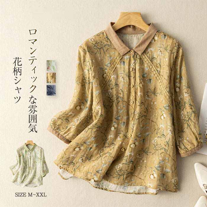 ガーゼシャツ 春夏 レディース コットン100% 五分袖 シャツブラウス 総柄 花柄 ドット柄 水玉 着回し 着心地 柔らか レイヤード 柔軟 仕事 お出かけ 日常 ディリー 30代 40代 50代