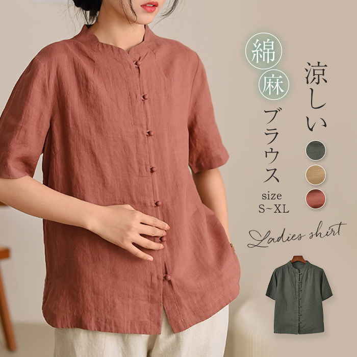 リネン シャツ レディース ブラウス 夏 麻 チャイナボタン 半袖トップス リネンシャツ シャツブラウス 半袖 春夏 無地 カジュアル トレンド