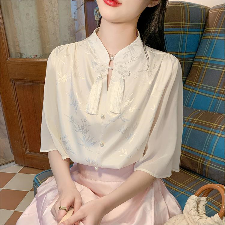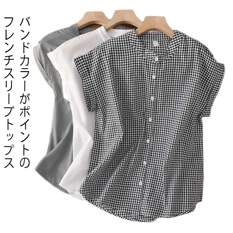 カジュアル ブラウス トップス フレンチスリーブ 前開き チェックシャツ レディース スタンドカラー シャツ 綿 春 フェミニン 無地 チェック柄 バンドカラー