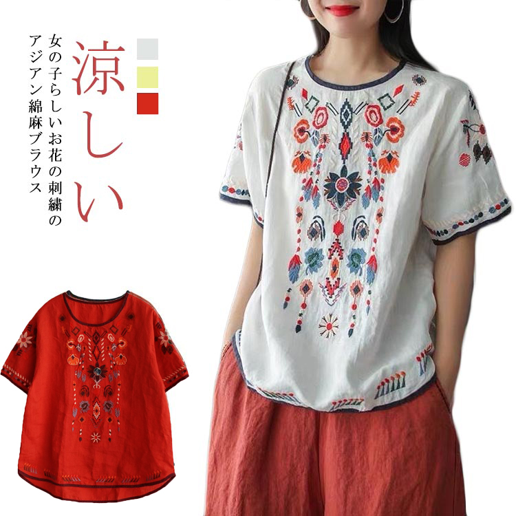 ブラウス エスニック チュニック 綿麻 オーバーサイズ 花 刺繍 アジアン 花柄 綿麻 春 夏 カジュアル シャツ