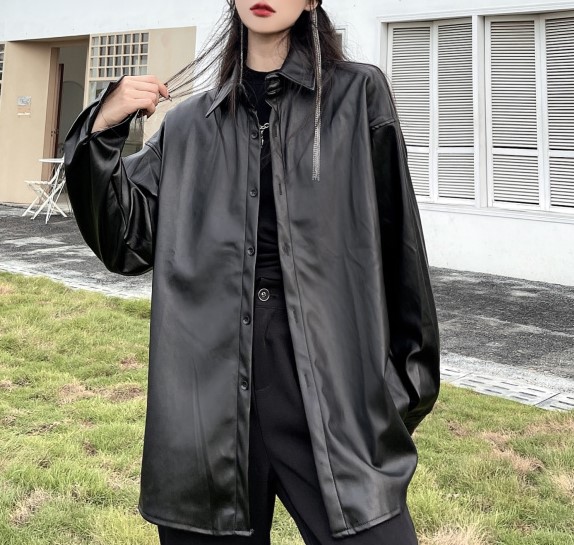 フェイクレザーブラウスシャツトップスカットソー長袖黒ブラック無地シンプル大きいサイズビッグジャケットアウターダンス衣装ヒップホップHIPHOPレディースメンズガールズレザー革韓国おしゃれかっこいいモノ