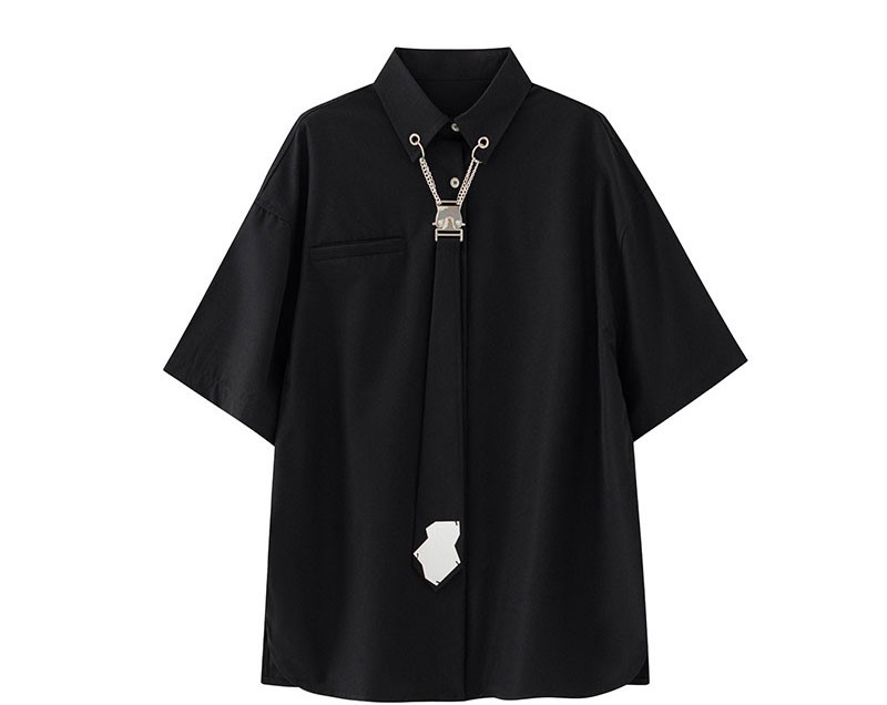 ネクタイ付ブラックシャツブラウス半袖トップス黒無地シンプルチェーン大きいサイズビッグゆったりダンス衣装ヒップホップレディースメンズガールズストリート個性的奇抜服上韓国おしゃれかっこいい