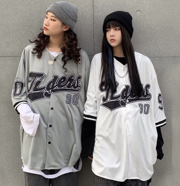 ユニフォーム風シャツ半袖五分袖ブラウストップスカットソーロゴナンバーベースボールスポーツ白ホワイトグレーダンス衣装ヒップホップHIPHOPレディースメンズガールズストリートスケーター