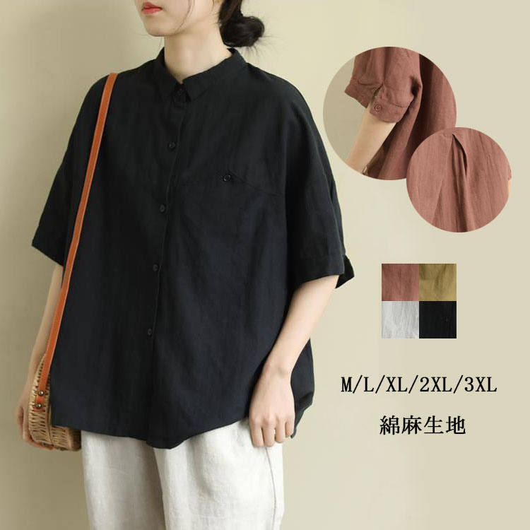 選べる8色&5サイズ Vネック綿麻風ブラウス シャツブラウス 半袖 シャツ レディース ブラウス 黒 春シャツ 春物 体型カバー 短袖 春服 カジュアル ゆったり 40代 50代
