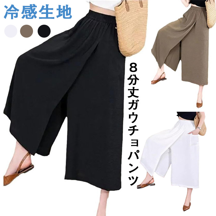 8分丈ガウチョパンツ レディース ボトムス ワイドレッグ パンツ スリム 無地 通気 快適 軽くて涼しい