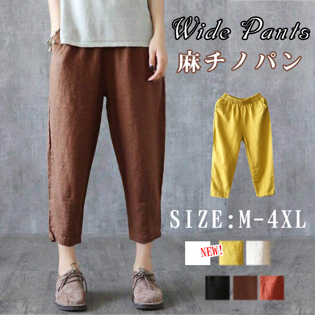 ワイドパンツ レディース ボトムズ チノパン サルエル ルームウェア 夏 リネンパンツ アンクル丈 綿麻 パンツ キレイめ 20代30代40代50代 着痩せ 無地