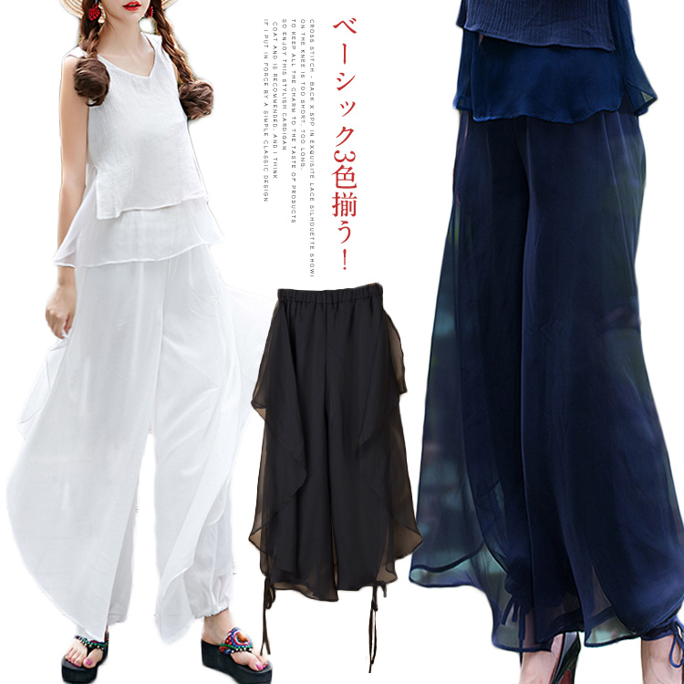 シフォンロングパンツ レディース ワイド ボトムス ウエストゴム 透け感 重ね 不規則レディースファッション ボトムス パンツ