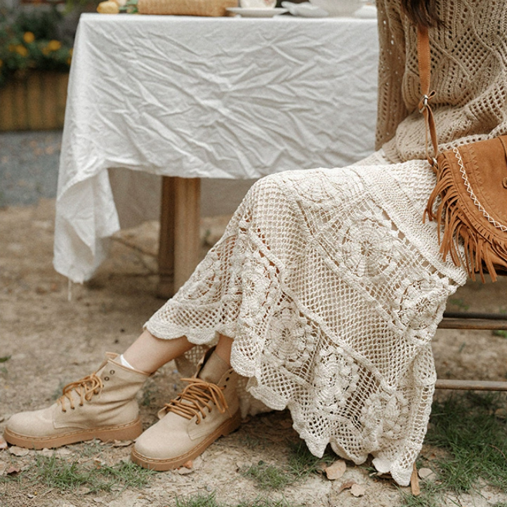他には無いデザイン かわいいざっくりモチーフ編みのロングスカート 春物 初夏レディースファッション ボトムス スカート