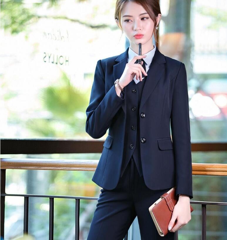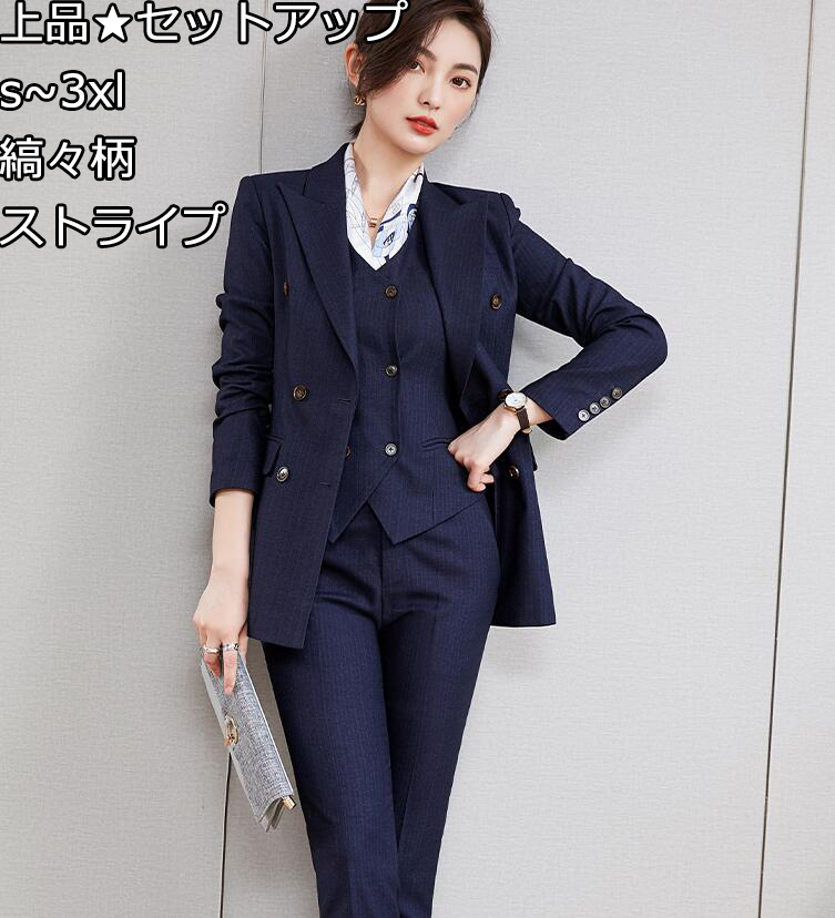 上品 ストライプ 縞々柄 3点セット レディース ジャケット+ベスト+パンツ スカート レディーススーツ 3ピーススーツ S~3XL スリムスーツ ネイビー