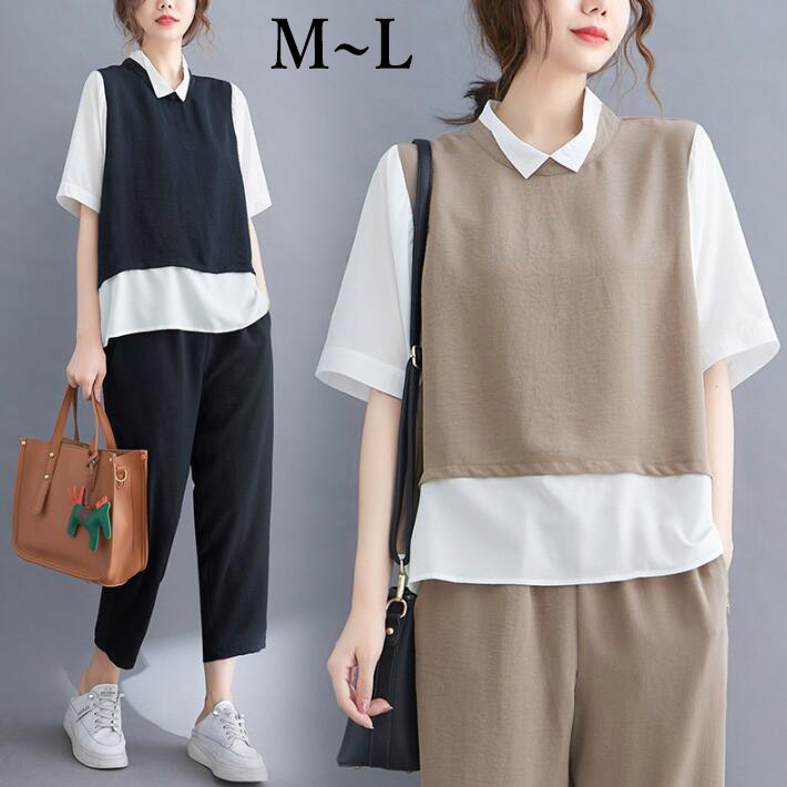 セットアップ2点セットシャツトップスボトムスパンツテーパードイージーパンツ半袖切替フィッシュテールウエストゴムレディースカジュアル大きいサイズ夏