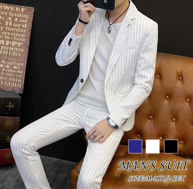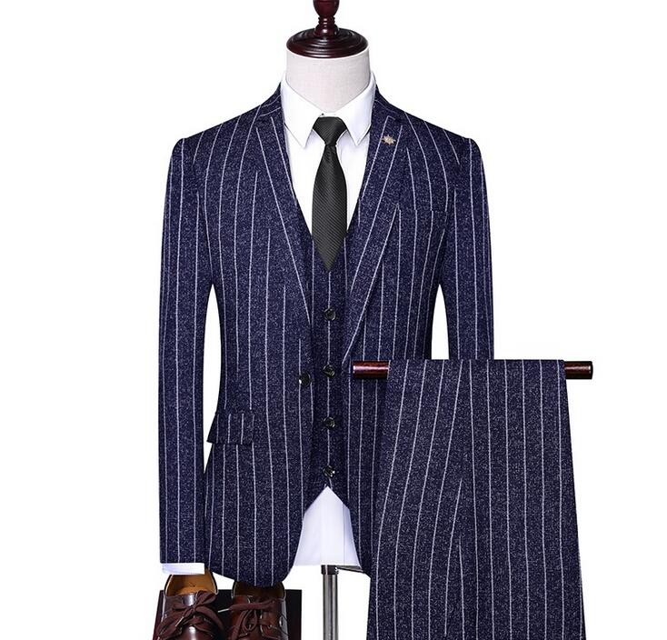 メンズスーツ 3ピーススーツ スリムストライプスーツ 紳士用 大きいサイズ タキシードジャケット+ベスト+パンツ 一つボダンスーツ 4色~4