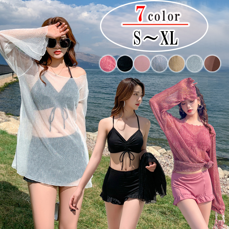 7カラー 4サイズ S M L XL 水着 レディース ビキニ ショートパンツタイプ シースルートップス フリル ブラック ホワイト ベージュ ピンク ブラウン 上下 セパレート 大きいサイズ