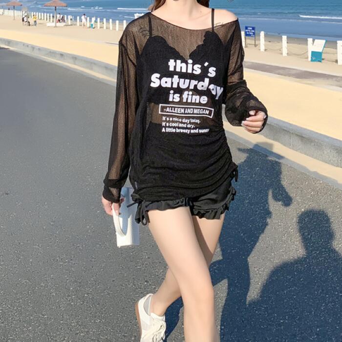 7カラー 4サイズ 水着 レディース ビキニ ショートパンツタイプ シースルートップス フリル ブラック ホワイト ベージュ ピンク ブラウン 上下 セパレート 大きいサイズ