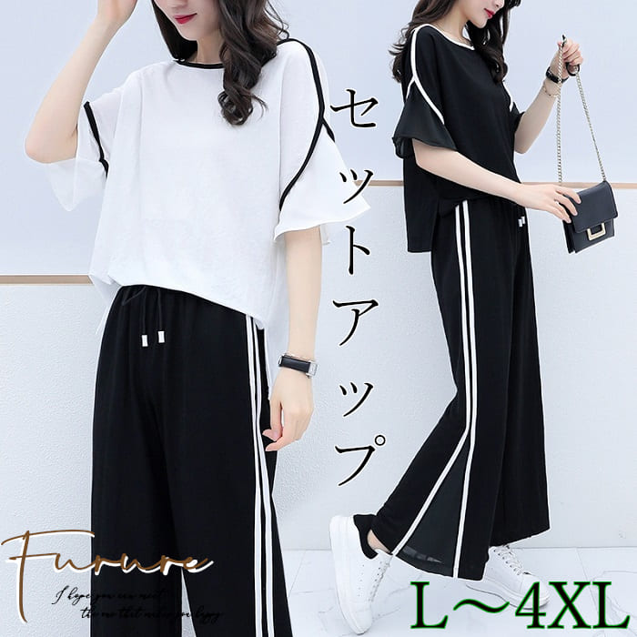 きれいめ レディース 韓国 春夏 大きいサイズ L~4XL セットアップ 上下セット 2点セット サイドライン スポーティー カジュアル ブラウス ボートネック 五分袖 半袖 パンツ ワイドパンツ ウ