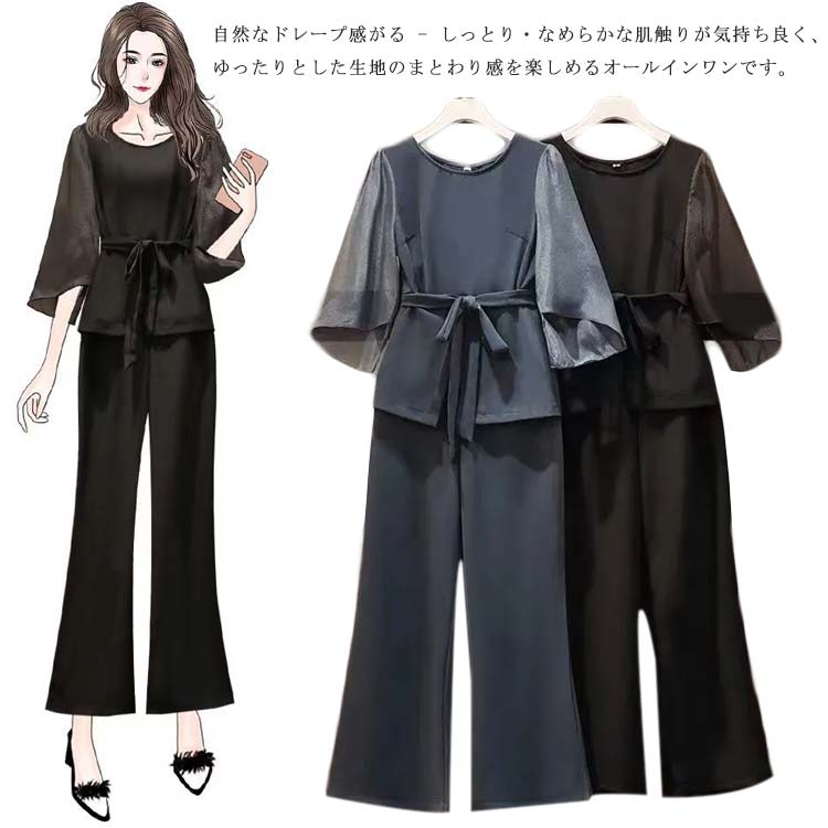 パンツスーツ セットアップ レディース シフォン パンツドレス 2点セット ワイドパンツ パーティードレス パンツ ブラウス シャツ フォーマル 春 夏 半袖 大きいサイズ スーツ オフィス 通