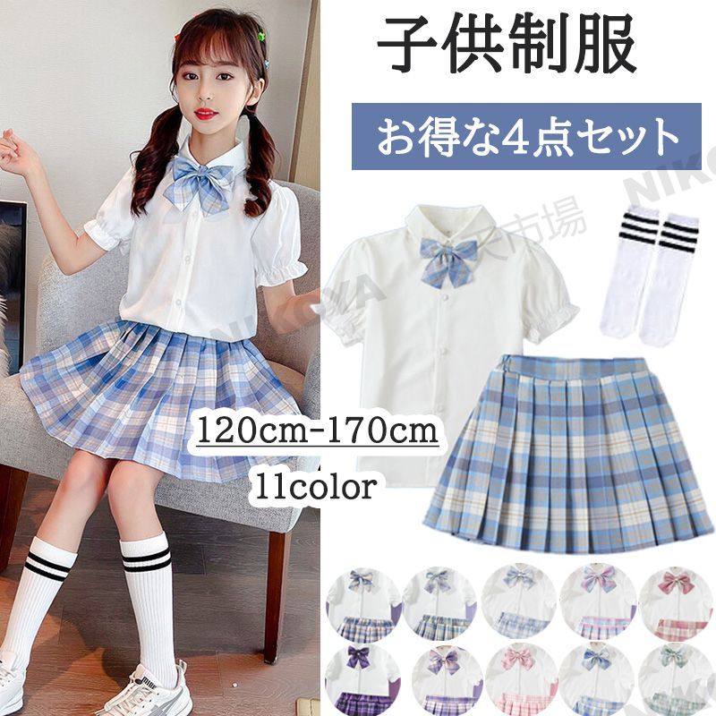 スクール 制服 4点セット 半袖 シャツ スカート 蝶結び 靴下 チェック かわいい 120cm 130cm 140cm 150cm 160cm 170cm 子供服 フォーマル