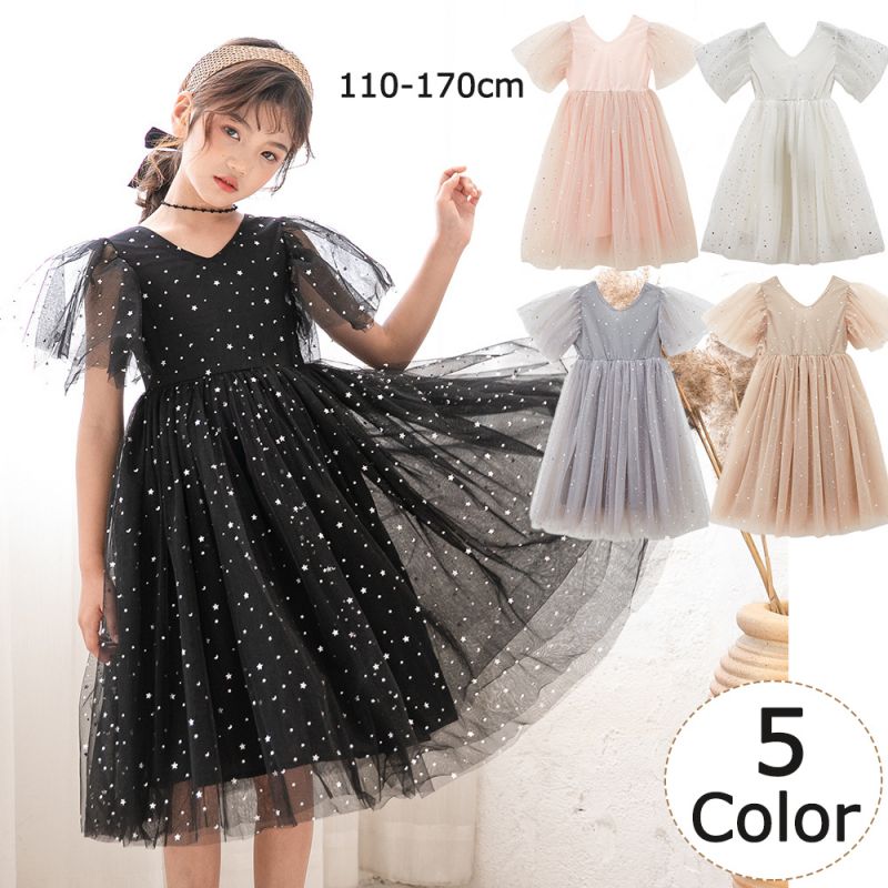 キラキラな星柄チュールの夏ワンピー キッズワンピー ロング丈 子供ドレス 110 120cm 130cm 140cm 150cm 160cm 170cm