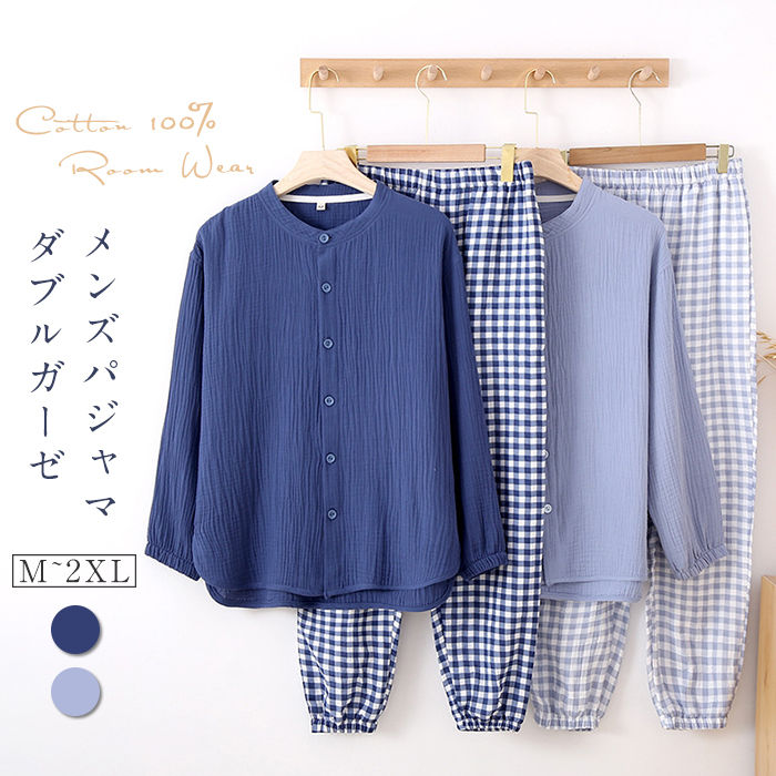 天然素材が気持ちいい綿100%ダブルガーゼのメンズパジャマです 襟なしのデザインにしたことで、優しい印象に 細めのステッチに仕上げて、パジャマ感を少なめに
