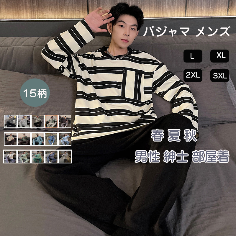 パジャマ メンズ ルームウェア 綿95% 上下セット セットアップ 丸首 ボーダー パジャマ 春夏秋 長袖 長ズボン 寝間着 ふんわり ゆったり 肌に優しい 学生服 学生用パジャマ