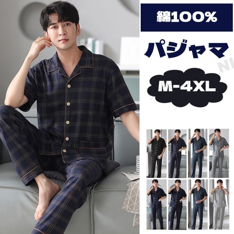 綿100% メンズ 半袖 パジャマ 上下セット 前開き ネイビー ブラック ブルー 160cm 170cm 180cm 190cm