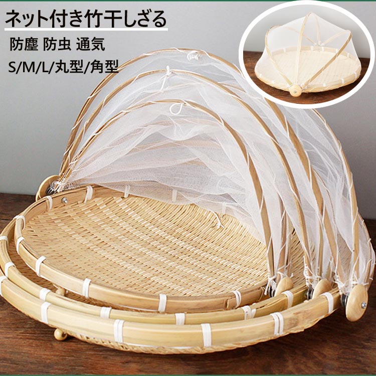 角型 丸型 干しざる ネット付 S M L ざる ザル 網付き 盆ざる 丸型 かご 干し野菜 一夜干し 竹ざる 防虫ネット