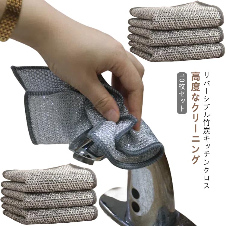 リバーシブル 竹炭 キッチンクロス 食器用キッチンタオル ワイヤーふきん 食器洗い布 両面 布巾 吸水 家庭用