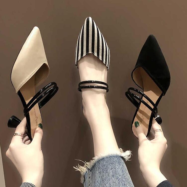 ミュール7ヒールハイヒールミュール サンダルレディース 靴 美脚 パーティ 履きやすい 歩きやすい ポインテッドトゥカットボーダー柄