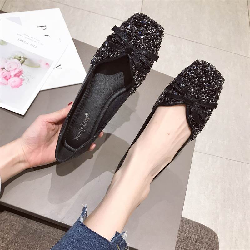 パンプス レディース シューズ ぺたんこ靴 リボン付き きらきら スパンコール ビーズ 装飾 フラット スクエアトゥ ローヒール カット 華奢見せ 歩きやすい 疲れにくい キラキラ かわいい