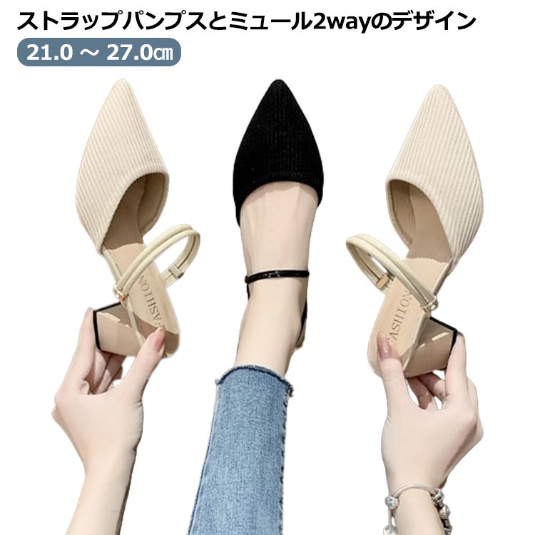 ストラップパンプス ミュール レディース ハイヒール ポインテッドトゥ 太ヒール チャンキーヒール 6 疲れにくい スリッパ 歩きやすい サンダル 履きやすい パンプス