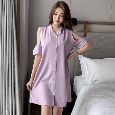 シャツワンピース 夏 レディース パジャマワンピ 5分袖 肩出し ネック ミニ丈 膝上 無地 10代 20代 30代 40代ママ お泊り 休日 ルームウエア パジャマ ナ