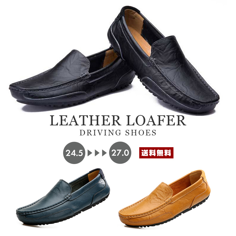 レザー ローファー ドライビングシューズ【メンズシューズ 靴 革 皮 リアルレザー 本革 カウレザー シワ加工 ソフトレザー スリッポン スタンダード 定番 防滑 軽量 柔軟 ステッチ シンプル カジ