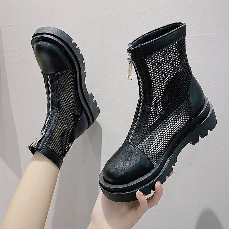 レディース ショートブーツ レザー メッシュ 白 黒 韓国 厚底 透け感 サマーブーツ ラウンドトゥ フロントジッパー ファスナー 5ヒール ミドルヒール 小さいサイズ 22.0 22.