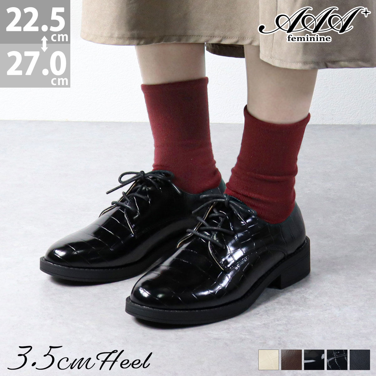 ローファー レディース マニッシュ 紐 靴 レースアップ 紐靴 おでこ靴 トラッド パンプス ワニ 太ヒール 3.5センチヒール 26センチ 27センチ メンズ