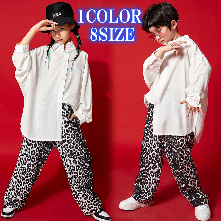 8サイズ ロングスリーブシャツ レオパード柄パンツ ヒョウ柄 襟付き 長袖 ホワイト 白シャツ キッズダンス ダンス衣装 ヒップホップ レッスン着 練習着 上下バラ売り