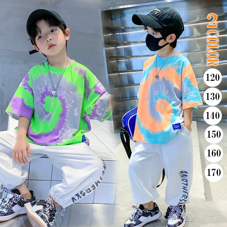 2カラー 6サイズ タイダイ風 キッズトップス キッズダンス ヒップホップ キッズ半袖Tシャツ うずまき 半袖 オレンジ グリーン カラフル レッスン着 練習着
