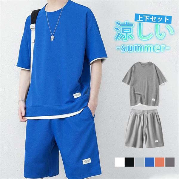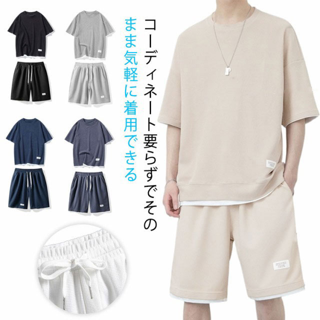 上下セット セットアップ ワッフル 夏 半袖 セットアップ メンズ 半袖 メンズ Tシャツ トップス ハーフ ショート パンツ 上下セット 無地 カジュアル 部屋着 ルームウエア 接触冷感