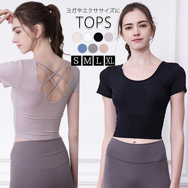 後ろ姿も隙なくオシャレに バックストラッピーヨガウェア♪ ヨガ Tシャツ ヨガトップス フィットネスウェア 薄手 短め 女性 動きやすい ブラライナー アンダーゴム
