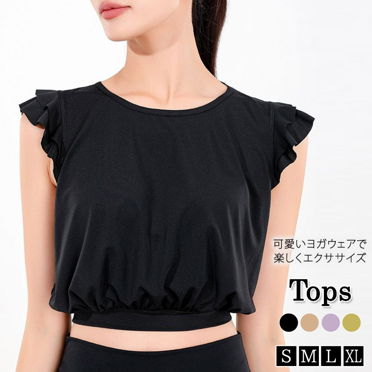 フリルフレンチスリーブがロマンティック、ショート丈で今っぽに ヨガトップス 女性 ノースリ 肩フリル スポーティー ホットヨガ フィットネスウェア バレエ ラウンドネック 落ち感