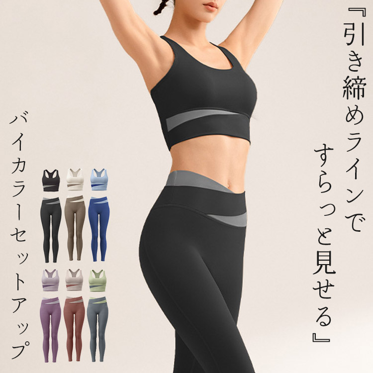 クロスバイカラーで美しいウエストラインを作り出す トレーニングウェア 女性 ヨガタイツ 美脚 スポブラ アシメ ホットヨガ 吸水性 速乾性 配色 カラーブロック くすみカラー