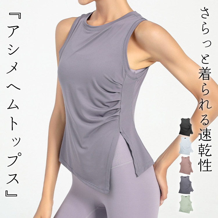アシメスリットで個性的な着こなしを 裾は結んでウエスト美人に ヨガトップス ヨガタンクトップ ヨガウエア 女性 ノースリ エクササイズ トレーニングウェア スタイリッシュ