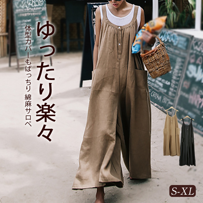 サロペット パンツ レディース オールインワン パンツ サルエルリネン綿麻リネン混マタニティ きれいめ楽ちんゆったり ワイドパンツオーバーオール 体型カバー 大きいサイズ 春夏秋2
