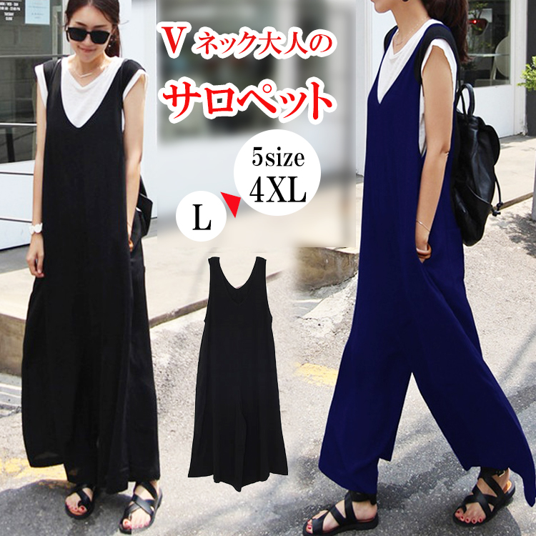 2カラー 5サイズ L XL 2XL 3XL 4XL Vネック大人サロペット ワイドパンツ Vネック オーバーオール ボトムス ロングパンツ ブラック ネイビー 無地 シンプル 体型カバー