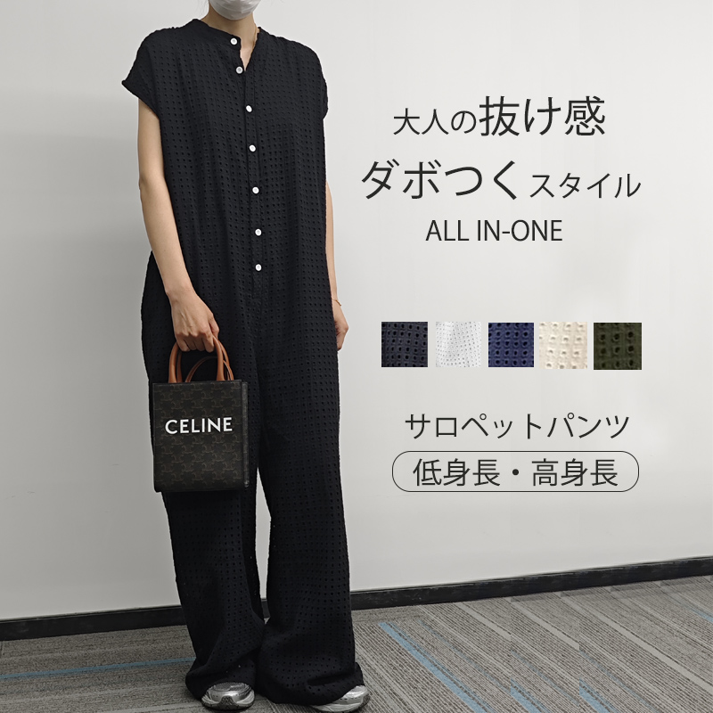 透かし編み つなぎ レディース フレンチスリーブ オールインワン レディース コンビネゾン オーバーオール サロペット ワイドパンツ ロングパンツ 連体服 裏地あり 黒 白 ホワイト