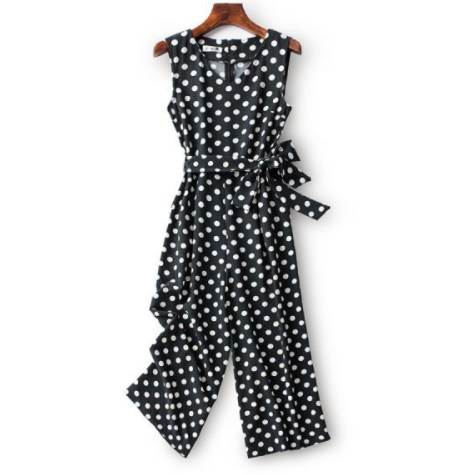サロペット パンツ レディース 個性的 ロング ノースリーブ ネック ワイド ガウチョ シフォン リボン ウエストマーク 大人可愛い おしゃれ ガーリー カジュアル ラフ 水玉 ドット 春 夏