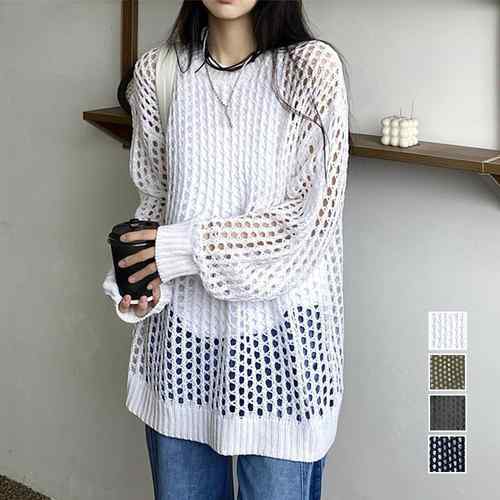 おしゃれサマーニット ゆったり レディース ニットブラウス プルオーバー韓国 重ね着フィッシュネットニット 肌見せ透け感 メッシュトップス秋 ざっくりニット春夏 かぎ編みニット大人